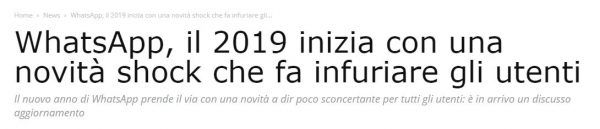 La prima cosa che vorrei sapere è dove sono gli utenti infuriati. Uso Whatsapp dalla sua nascita e non vedo traccia di utenti infuriati… E dire che della “novità”, di cui si parla dal 31 ottobre 2018. Al momento oltretutto non mi pare affatto attiva in Italia come anche nel resto del mondo. Anche perché il titolone rilanciato da noi non è altro che il copia, traduci e incolla di articoli lanciati in chiusura d’anno da testate come Daily Mail e The Sun.
