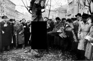 Corpo di un agente AVH appeso e colpito dalla folla a Budapest. L’immagine è stata oscurata per non urtare la sensibilità dei lettori, ma è di facile reperimento su internet.