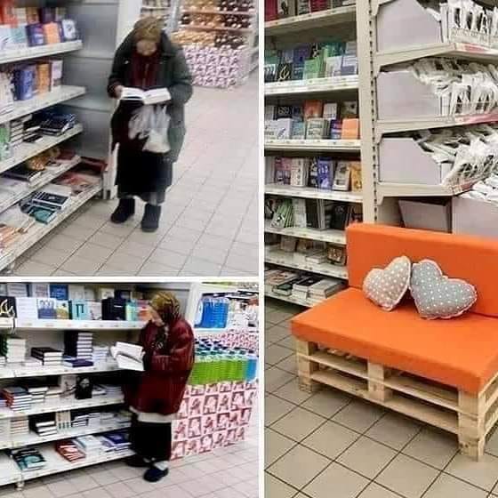 Una signora senza fissa dimora, ogni giorno va al Centro commerciale. Raggiunge gli scaffali dei libri in vendita e comincia a leggere, un libro dopo l’altro, giorno dopo giorno. Accortosi del fatto, il direttore del Centro commerciale ha fatto mettere una piccola panchina vicina allo scaffale dei libri, invitando la donna a sedere, in modo da poter leggere i libri tranquillamente. E senza il timore che qualcuno la cacciasse fuori.