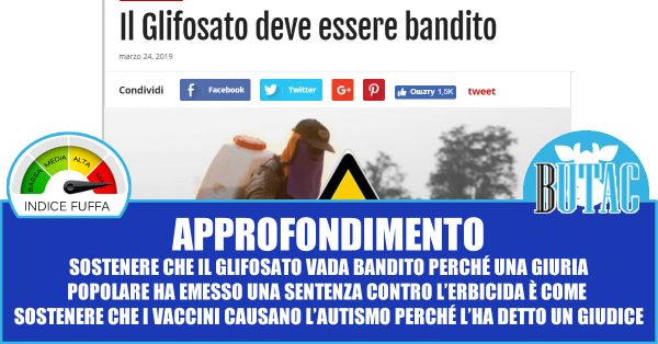 Quell’affermazione tra virgolette è errata. Se avessero voluto essere corretti avrebbero dovuto scrivere: “Secondo una giuria popolare il glifosato è la causa della malattia di un giardiniere americano”. Ma ovviamente l’impatto del titolo sarebbe stato molto inferiore. LO stesso vale per la notizia di questi giorni, è sempre una giuria popolare ad aver espresso il proprio parere. Non la comunità scientifica, non esperti super partes. Una giuria popolare composta da persone comuni.