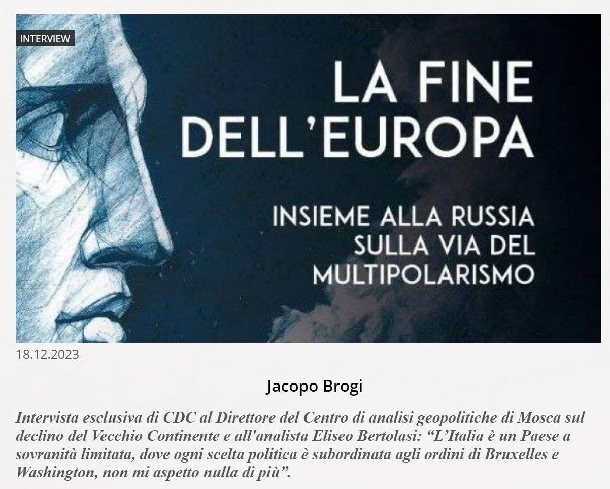 Intervista esclusiva di CDC al Direttore del Centro di analisi geopolitiche di Mosca sul declino del Vecchio Continente e all’analista Eliseo Bertolasi: “L’Italia è un Paese a sovranità limitata, dove ogni scelta politica è subordinata agli ordini di Bruxelles e Washington, non mi aspetto nulla di più”.