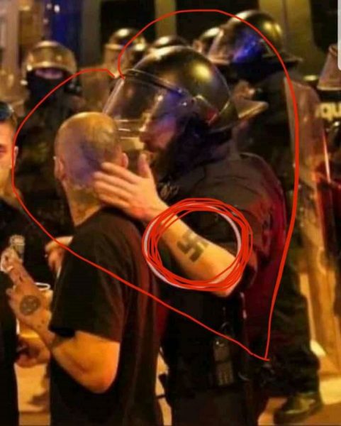 Si vedono due persone nell’immagine, una indossa un’uniforme antisommossa, con regolare caschetto protettivo, sul braccio scoperto dalla manica tirata su ha una svastica. Viene condivisa dando a intendere che sia una foto dei poliziotti alla manifestazione delle destre italiane del 19 ottobre. Qualcuno ha sostenuto che i poliziotti non possano avere tatuaggi e quindi sia un falso, ma in realtà i poliziotti possono, dipende da che tipo di tatuaggio però. Come riporta il sito della Polizia di Stato:
