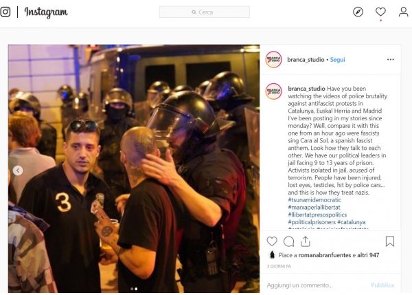 Una svastica credo sarebbe bocciata. Ma basta una veloce verifica per scoprire che la foto viene dalla Catalogna, non dall’Italia, ed è stata ritoccata ad arte per aggiungere una svastica sul braccio, come dimostra la fonte originale: