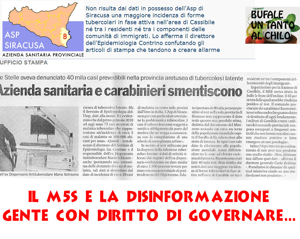 E oggi abbiamo questa perla del M5S: un video denuncia che riguarda la TBC e Siracusa. Nei primi tre minuti ci narrano dati dell’OMS tirati a caso, senza che vengano contestualizzati in alcuna maniera, poi partiamo con le bufale… i 5stellati a questo giro la sparano grossa: 5000 nuovi casi ogni anno di TBC in Italia, quando i numeri dell’OMS in una ricerca del 2012 parlano di 5000 casi l’anno nel 1995 (in tutta Italia), mentre oggi sono meno di 1700…