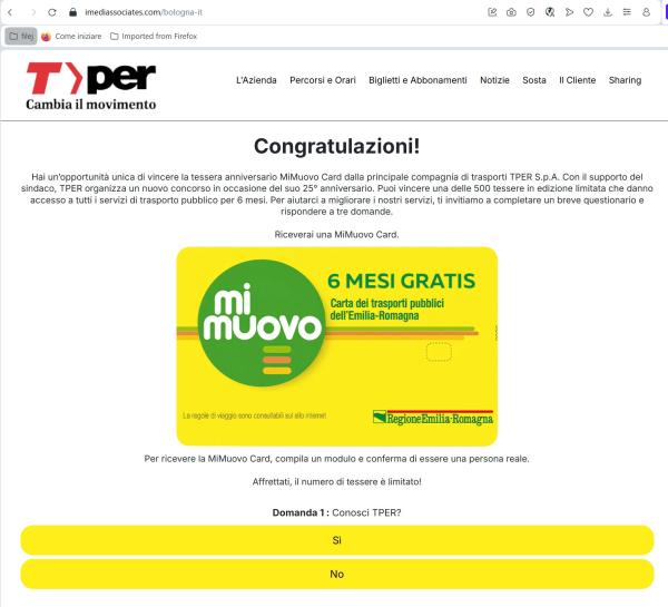 Da lì si è spinti a cliccare su un link che ovviamente non ha nulla a che fare con TPER, link dove vengono poste le solite domandine facili facili, con pulsanti belli grandi (perché è evidente a chi si rivolgono questi post, persone anziane a cui non dispiacerebbe risparmiare un po’ su un servizio che utilizzano abitualmente).