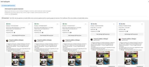 Se andiamo a vedere la “libreria inserzioni” scopriamo che una paginetta nata solo il 7 luglio 2025 in due mesi e mezzo ha fatto tantissime inserzioni – visto che di ognuna ha realizzato più versioni – con il conseguente guadagno della piattaforma su cui le stesse vengono pubblicate.