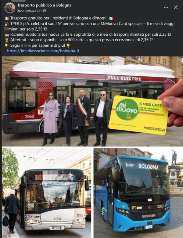 Oggi partiamo da un post sponsorizzato che riguarda (nuovamente) il servizio di Trasporto Pubblico della mia zona, TPER, ma l’articolo potremmo farlo per quasi tutte le aziende di trasporto pubblico italiane, perché i truffatori stanno producendo post sponsorizzati uguali identici anche nelle altre città. Cambiano le pagine da cui questi vengono diffusi, cambiano i claim, ma il succo è sempre lo stesso: registratevi sul nostro sito, rispondete a poche semplici domande, e potrete accedere a tessere ultrascontate per viaggiare su bus, tram e metro della vostra zona di provenienza.