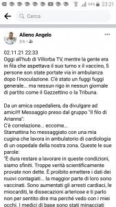 “02.11.21 22:33 Oggi all’hub di Villorba TV, mentre la gente era in fila che aspettava il suo turno x il vaccino, 5 persone son state portate via in ambulanza dopo l’inoculazione. C’è stato un fuggi fuggi generale… ma nessun rigo in nessun giornale di partito come il Gazzettino o la Tribuna.