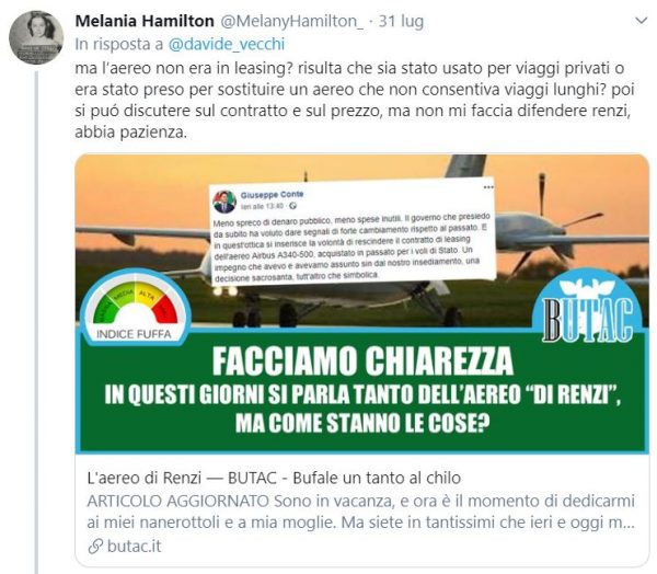 Il tweet di Melania riassume in poche righe il contenuto del mio articolo di un anno fa. L’aereo non era comperato ma era in leasing, e non è stato usato per scopi privati. Il tutto per spiegare a Vecchi che il paragone col giro in moto d’acqua del figlio di Salvini fosse in qualche modo errato.