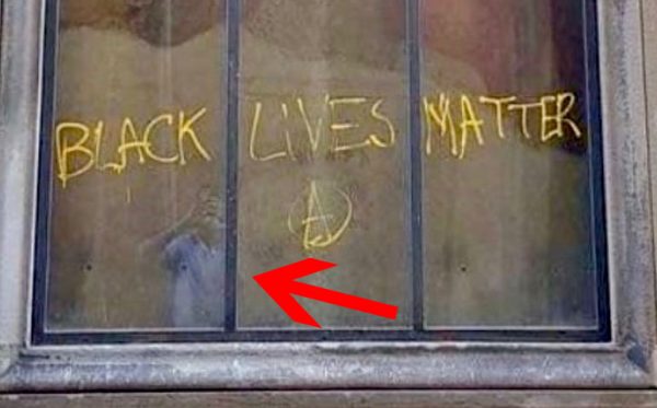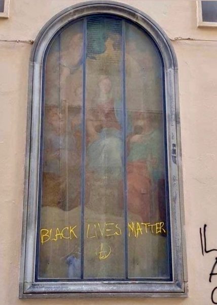 Ma evidentemente anche a lui (e ai tanti altri che la stanno facendo girare grazie anche al post su ImolaOggi) il sangue al cervello arriva lento. Perché è abbastanza evidente che la scritta Black Lives Matter non è sulla Madonna, ma su un vetro messo a protezione della stessa. Vetro che riflette molto chiaramente il signore che ha scattato la fotografia.