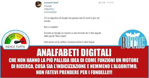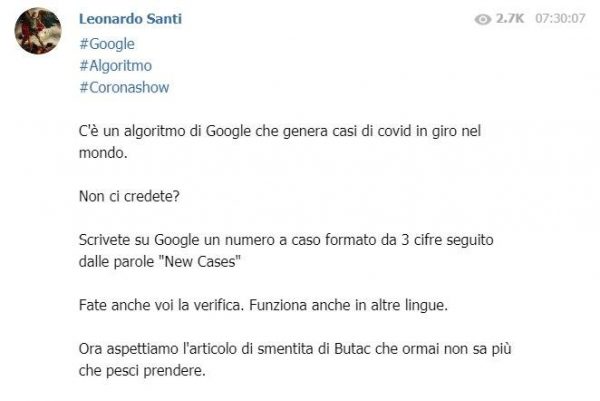 C’è un algoritmo che genera casi di covid in giro nel mondo. Non ci credete? Scrivete su Google un numero a caso formato da 3 cifre seguito dalle parole “New Cases”. Fate anche voi la verifica. Funziona anche in altre lingue. Ora aspettiamo l’articolo smentita di BUTAC che ormai non sa più che pesci prendere.