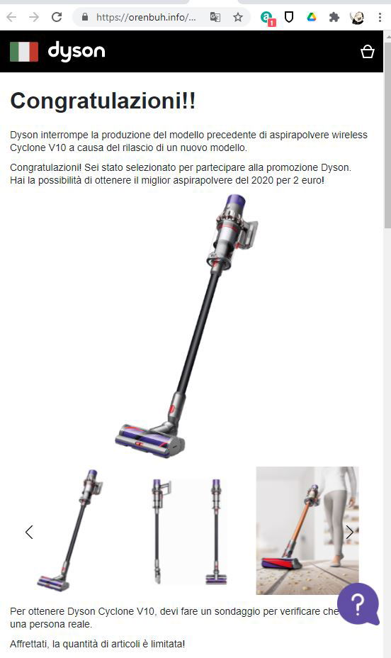 Si parte dal primo messaggio trionfante che vi abbiamo mostrato sopra, dove ci viene detto che siamo stati selezionati per partecipare alla promozione Dyson del 2020. Abbiamo la possibilità di ottenere il miglior aspirapolvere del 2020 per soli 2 euro. Che figata, eh?