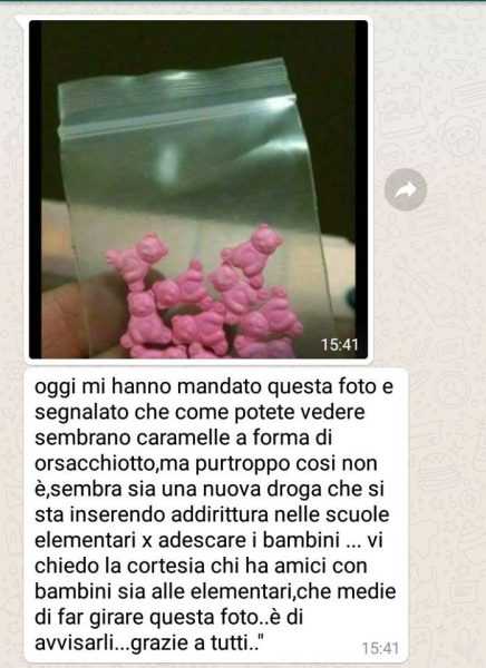 oggi mi hanno mandato questa foto è segnalato che come potete vedere sembrano caramelle a forma di orsacchiotto,ma purtroppo cosi non è,sembra sia una nuova droga che si sta inserendo addirittura nelle scuole elementari x adescare i bambini, io personalmente sono rimasta letteralmente scioccata!vi chiedo la cortesia chi ha amici con bambini sia alle elementari,che medie di far girare questa foto..è di avvisarli…grazie a tutti..stiamo arrivando davvero a livelli paurosi..dio mio!