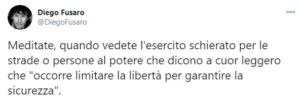 Meditate, quando vedete l’esercito schierato per le strade o persone al potere che dicono a cuor leggero che “occorre limitare la libertà per garantire la sicurezza”.