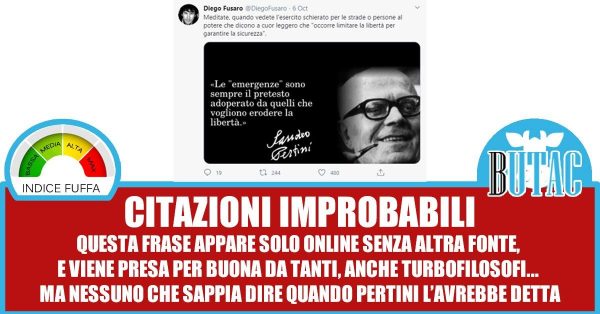 Sulla bacheca del nostro filosofo preferito è apparso un meme con una citazione attribuita a nientepopodimeno che Sandro Pertini, uno dei Presidenti della Repubblica più amati di sempre. Uno che probabilmente a Diego Fusaro tirerebbe volentieri due pizze in faccia.