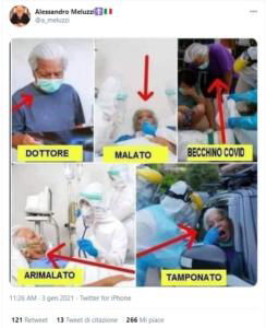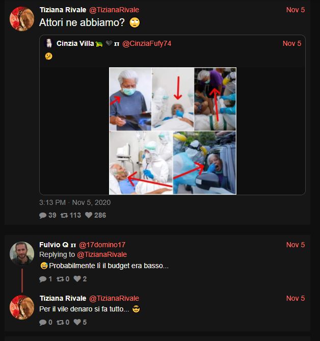 Tiziana non fa altro che condividere il post di qualcun altro e con lei tanti… solo dal suo profilo 113 persone lo fanno ricircolare, perlopiù altri follower di Q. Sarebbe bello che la polizia postale pigliasse questa gente e la sanzionasse per disinformazione su un tema grave come la pandemia. Ma purtroppo ormai è chiaro che sono così tanti i qanoglioni (anche se voi non ci volete credere) che se ci mettessimo a sanzionarli tutti da un lato avremmo sanato le casse statali per decenni, dall’altro però saremmo sull’orlo di una guerra civile.