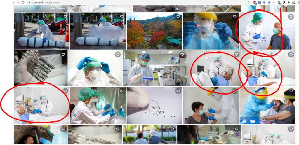 Questo collage di foto l’hoi visto girare sempre di più nei giorni scorsi, e credo sia già da un po’ che ha fatto la sua comparsa su alcune pagine negazioniste. Non stiamo a perdere tempo nel vedere chi e come l’abbia realizzato, non è importante, la cosa importante è capire che non si tratta di un’immagine che dimostra la falsità dell’epidemia, ma solo di un collage di foto stock. Ovvero foto realizzate da uno studio fotografico e poi vendute online a chi ne faccia richiesta.