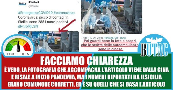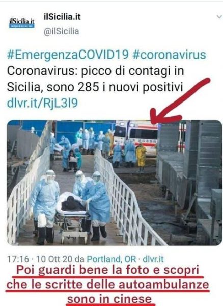 Chi la sta facendo circolare ha ragione, la foto mostra delle ambulanze con ideogrammi su una fiancata, non lettere del nostro alfabeto. E quindi? Che cosa conta? Sono forse falsi i 285 nuovi positivi in Sicilia? No. Sono confermati. L’immagine sicuramente dà un’idea errata di emergenza, i nostri medici e infermieri non stanno circolando come nella foto. E in Italia l’emergenza per ora è molto contenuta. In crescita, ma contenuta.