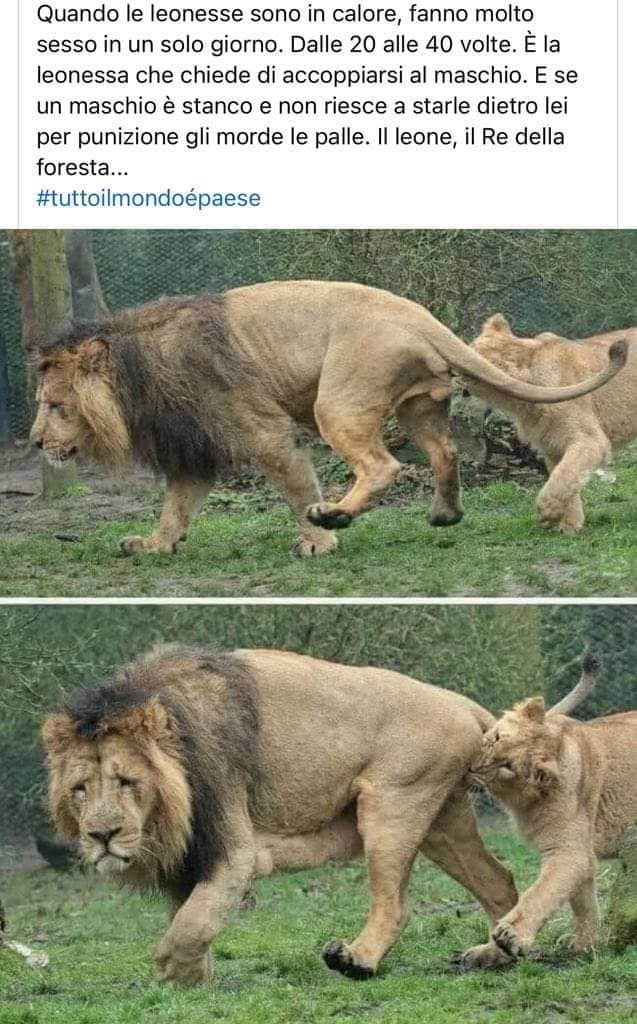 Quando le leonesse sono in calore, fanno molto sesso in un solo giorno. Dalle 20 alle 40 volte. È la leonessa che chiede di accoppiarsi al maschio. E se un maschio è stanco e non rie4sce a starle dietro lei per punizione gli morde le palle. Il leone, il Re della foresta… #tuttoilmondoépaese