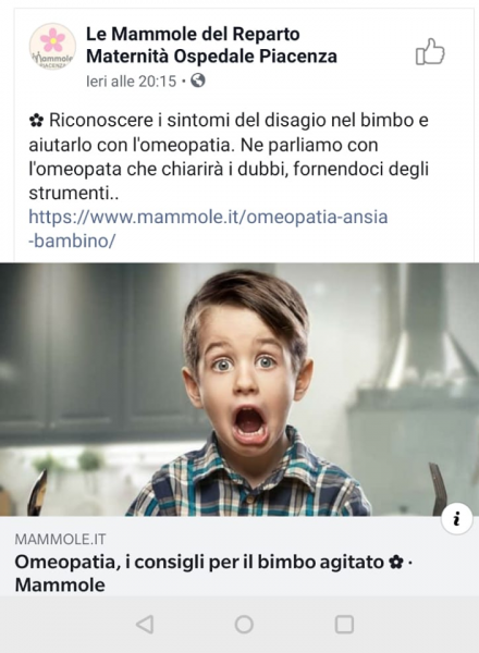 L’elenco credo potrebbe andare avanti a lungo, sono tutte pagine collegate a un sito web ben preciso che si chiama appunto Le Mammole, e condividono (oltre a informazioni geolocalizzate) tanti articoli che vengono sempre dallo stesso sito. Tra gli altri anche articoli che spingono l’uso dell’omeopatia coi bambini. Se leggete BUTAC da un po’ sapete bene come la penso sull’omeopatia. Ma qui non voglio farne un discorso legato alla pratica, bensì alla comunicazione. Ovviamente chi si trova su una pagina che riporta il nome dell’ospedale dove magari sta per partorire si sente in qualche maniera tutelato, anche se i gruppi riportano sempre chiaramente il fatto che sono pagine NON ufficiali e quindi non legate agli ospedali in questione.