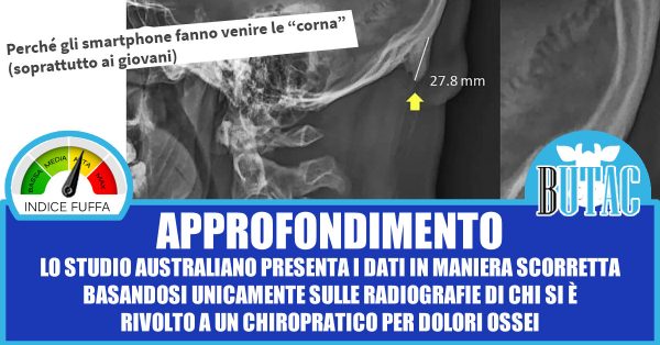 Lo studio australiano si basa sulle lastre di 300 persone tra i 18 e i 30 anni. Le lastre arrivano dagli studi dei chiropratici australiani. Il campione è basso, ma non solo, il fatto che le lastre arrivino da studi di chiropratici è sintomo del fatto che questi soggetti si siano rivolti a uno specialista per un problema. Quindi sono persone che presumibilmente presentano dolori di qualche genere. Possibile che siano persone che presentano a priori quel tipo di formazione ossea. Solo un’analisi di lastre di un campione di popolazione che non si è rivolto al chiropratico può permetterci di fare confronti sensati. Ma lo studio quell’analisi e quel confronto non li fa.