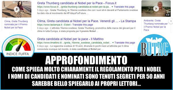 Greta Thunberg è stata proposta da uno dei tanti gruppi e organizzazioni che possono proporre nomi alla commissione per il Nobel. Quest’anno sono arrivate 301 possibili nomi, nessuno di quelli presi in considerazione sarà reso noto se non fra 50 anni. Parlare di candidature quando non si sa quali dei nomi sia nell’elenco è disinformare. Questa disinformazione è quella che poi permette a certi soggetti di spacciare fischi per fiaschi.