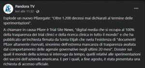 Ma siamo seri? Tutta la prima parte non è altro che un riprendere quanto da noi trattato il 9 dicembre con l’aggiunta di cinque morti in più. Non si tratta di “un nuovo Pfizergate” ma di una notizia che è trattata da fine novembre 2021, da noi come da altri, notizia che è stata approfondita appunto il 9 dicembre dopo che FDA ha pubblicato le prime pagine degli studi Pfizer. Studi che non sono mai stati celati a nessun organismo sanitario. Studi che sono stati letti da EMA, AIFA FDA e tutte le agenzie statali che hanno delega sulla sanità pubblica nei vari Paesi in cui il vaccino Pfizer è stato approvato e usato da dicembre 2020. EventiAvversi e PandoraTv vi prendono per i fondelli, trasformando la storia in una “nuova” notizia disegnata ad hoc per spaventarvi. Perché questa gente fa sempre leva sulla paura.