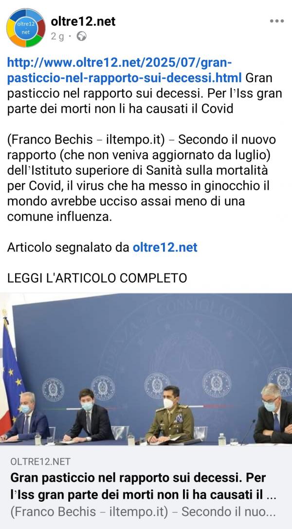Gira da giorni l’immagine di un articolo de Il Tempo che critica un rapporto ISS.L’immagine è senza data e senza link all’articolo, figurati.Approfondisco e scopro che l’articolo è di ottobre 2021, nel sito del giornale non c’è più ma si trova altrove.Inoltre scopro che ISS ha risposto con una nota per spiegare come il giornalista ha interpretato male i dati.Poi scopro che un sito, oltre12.net, fa un articolo datato luglio 2025 dove si parla di questo NUOVO report ISS. L’articolo poi mette il link alla notizia che è appunto di ottobre 2021.
