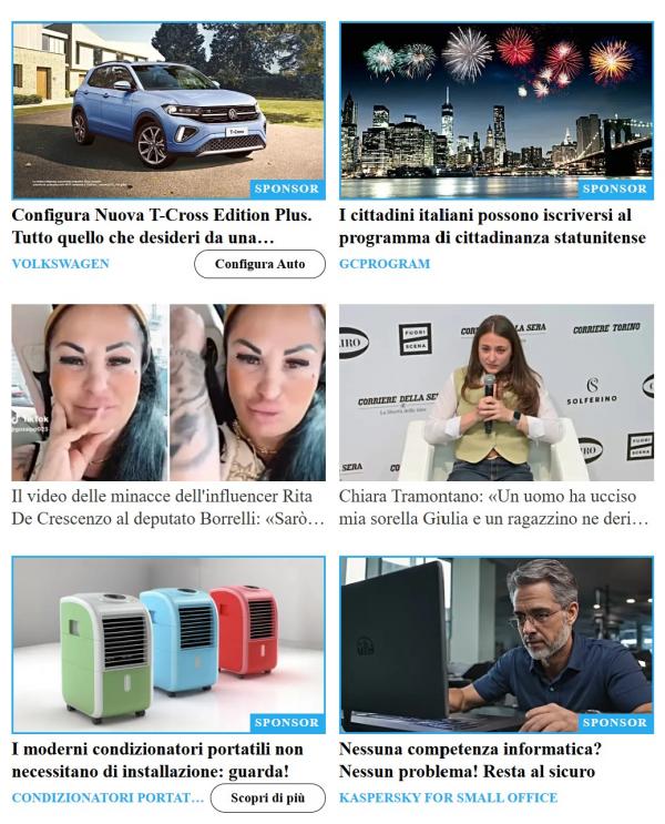 I due centrali sono link ad articoli del Corriere, gli altri quattro sono pubblicità; quelle della Volkswagen e di Kaspersky sono normali annunci, ma quella per le green card è una fregatura con base in Bulgaria, che ci invita a pagare 39 dollari per chiedere una green card per gli Stati Uniti tramite un sito che ha sede in un centro commerciale di Burgas: