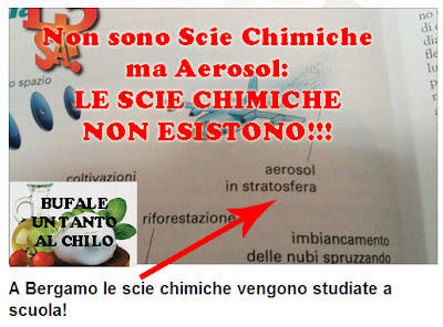 L’ignoranza è una brutta bestia…con l’articolo che linko qui sotto (ma se evitate di visitare il link è meglio…così il gettone di visibilità evitiamo di darlo a questi cretini) qualcuno vuol far credere che l’esistenza delle Scie Chimiche è DIMOSTRATA da un testo scolastico! Peccato che il testo in questione parli di aerosol, non di chemtrails (dette anche scie chimiche), nessuno nega l’esistenza di aerosol (inquinamento atmosferico naturale e/o artificiale) causato da particelle e corpuscoli presenti nell’atmosfera.