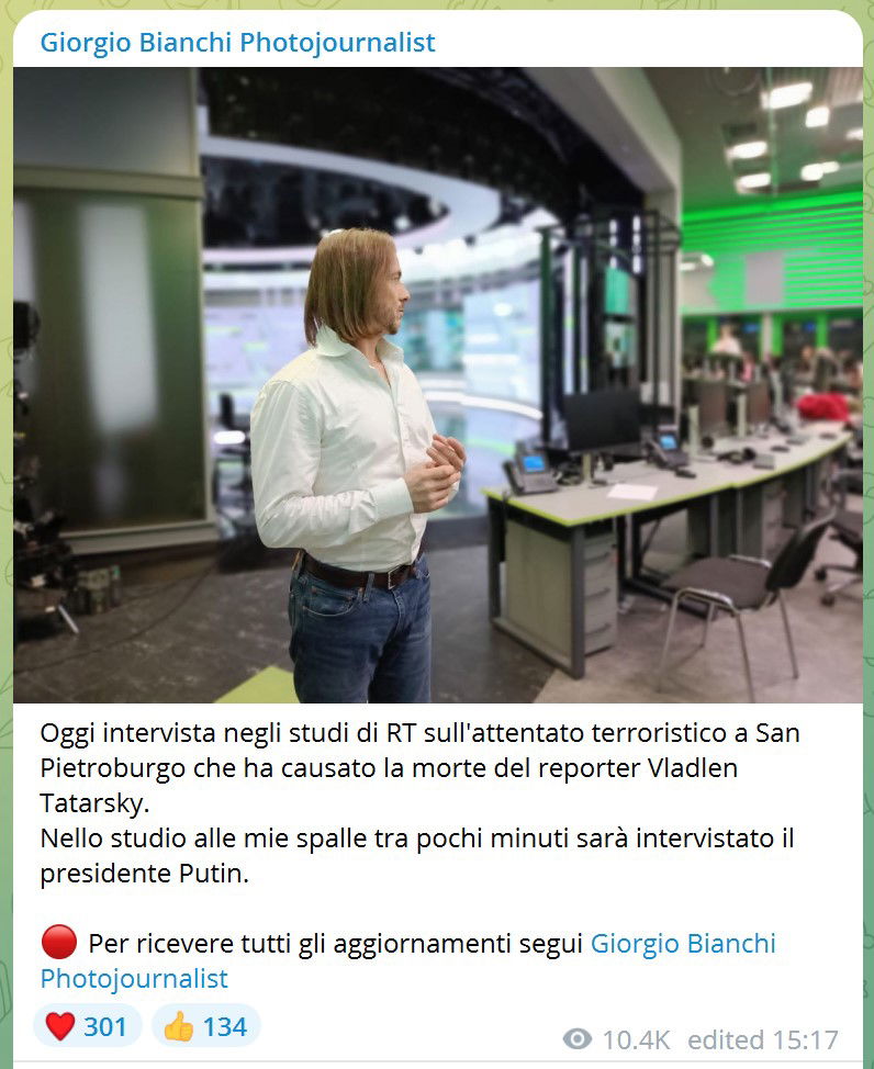 5 aprile 2023 Oggi intervista negli studi di RT sull’attentato terroristico a San Pietroburgo che ha causato la morte del reporter Vladlen Tatarsky. Nello studio alle mie spalle tra pochi minuti sarà intervistato il presidente Putin.