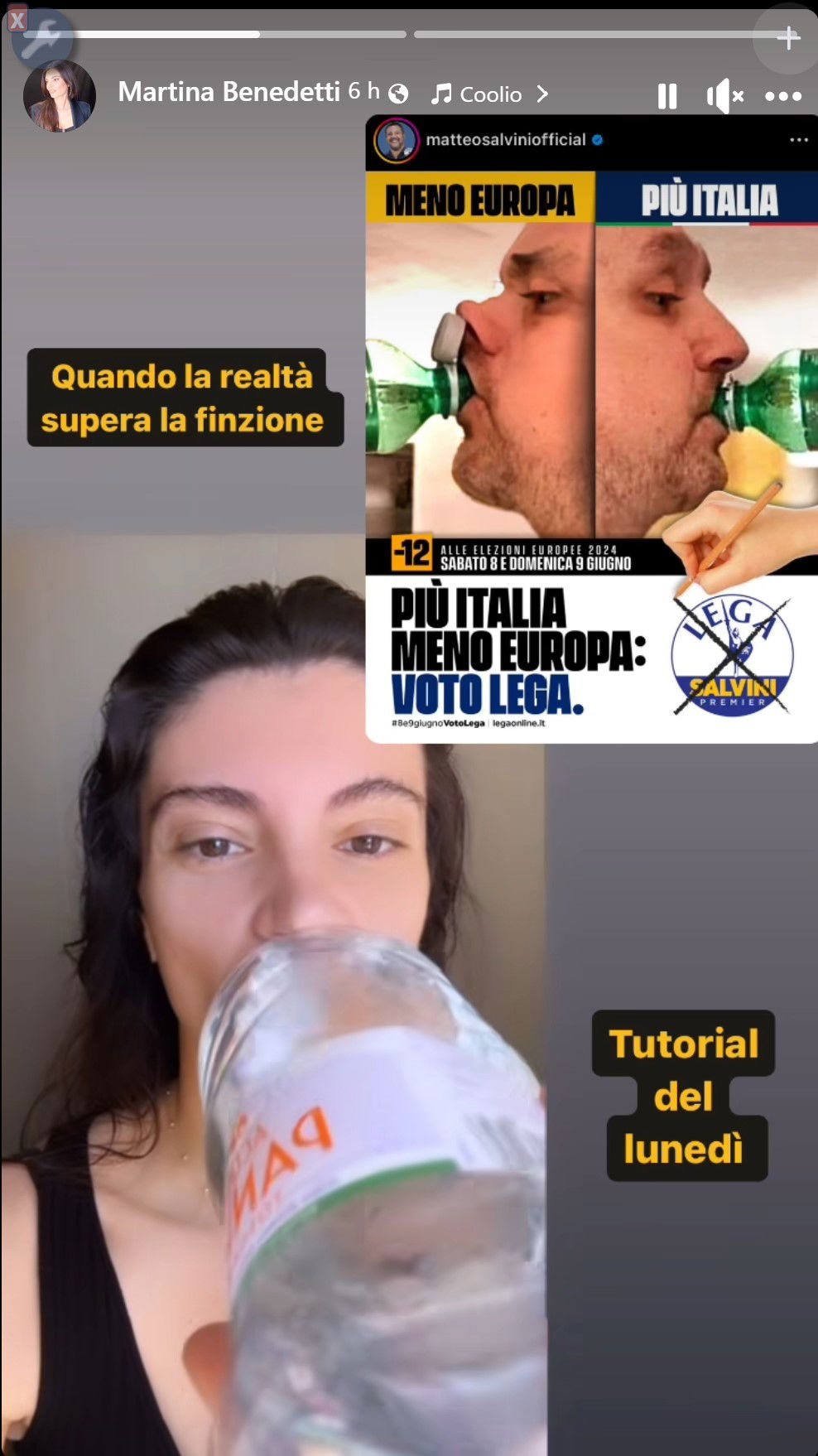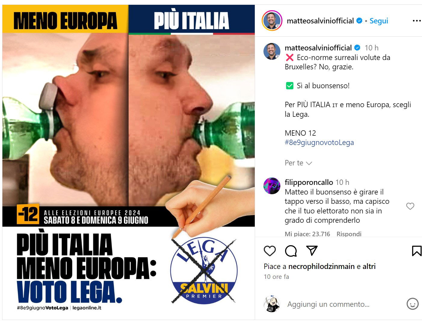 L’immagine, condivisa dal profilo Instagram di Matteo Salvini, mostra un tizio cercare di bere da una bottiglia col tappo attaccato come da recente direttiva UE, e al confronto uno che beve da una bottiglia senza tappo.