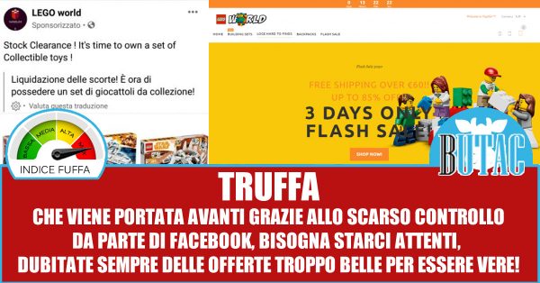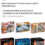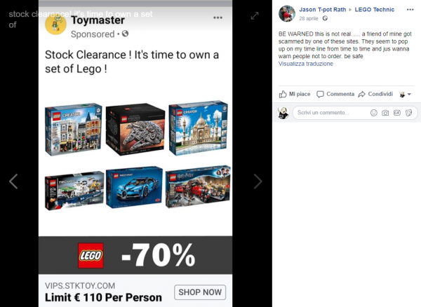 Sconti fino al 70% su confezioni Lego da collezione, un’offerta che ovviamente per tanti appassionati è imperdibile. Si tratta di post sponsorizzati, quindi qualcuno ha pagato Facebook, che sa benissimo da chi ha ricevuto i denari. Denari che sono serviti per dare più visibilità a una truffa.