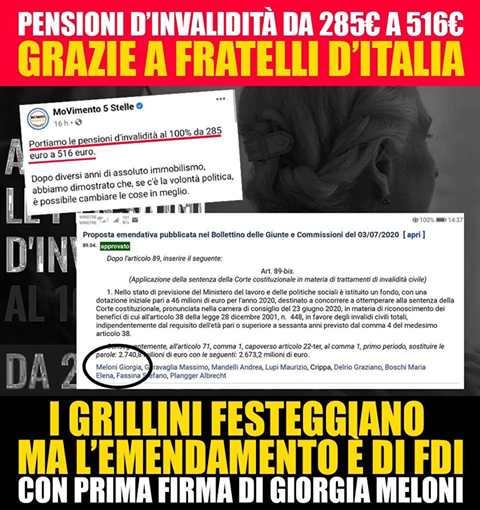I Grillini festeggiano ma l’emendamento è di FDI con prima firma Giorgia Meloni.