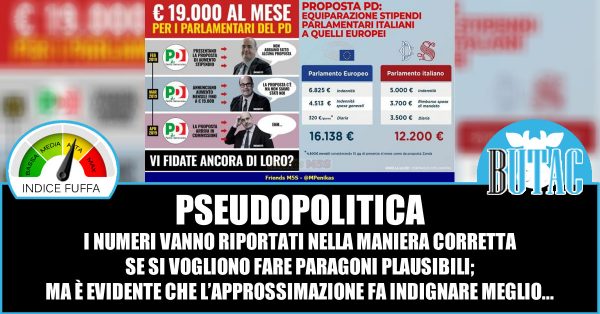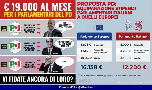 Partiamo dall’immagine. Non è subito comprensibile, o meglio è chiaro che l’attacco è verso la proposta del PD di equiparazione tra stipendi dei parlamentari italiani e europarlamentari. Nel poster si fa, intenzionalmente, un po’ di confusione che ritengo vada chiarita. Prima si parla di 19mila euro al mese per i parlamentari del PD, poi viene mostrata una comparazione dove i conti dicono 16138 contro i 12200 euro che attualmente incassano i parlamentari italiani.