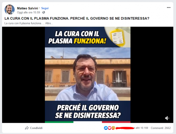 #Salvini: Perché su cure con plasma iperimmune governo non chiede nulla e ISS se ne disinteressa? Molti cittadini potrebbero avere il dubbio che siccome plasma è gratis, non c’è dietro un business milionario, è meglio occuparsi di altro… #FBLive