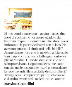 Ripeto, l’insegnante non è stata condannata per aver rimproverato gli alunni (senza oltretutto avere un colpevole, o due o tre o cinque) ma per i modi e toni inadatti riscontrati non solo dai genitori e dal preside ma anche dalle colleghe. Ma anche Gramellini ha probabilmente scritto il suo pezzo senza nemmeno il tentativo di approfondire, sapeva che avrebbe raccolto consensi, perché è così che si fa giornalismo in Italia!