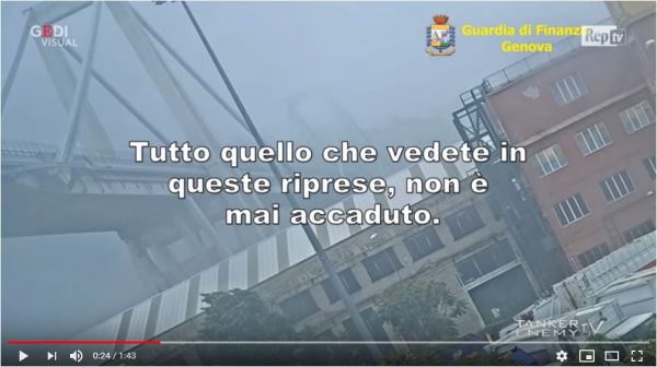 Nessuna sequenza del filmato desecretato dalla Procura di Genova può ritenersi genuina. Ci sono almeno venti (20) fotogrammi riciclati. Tutto è dimostrato frame per frame. Ho per l’occasione realizzato un un montaggio video atto a mettere in chiara evidenza quali e quanti fotogrammi sono stati impiegati più volte per realizzare il falso del Secolo, ad opera delle autorità governative. Il video prodotto dalla Procura genovese porterebbe l’acqua al mulino dei fautori del cedimento strutturale e per questo TUTTE le sequenze del crollo sono state create da zero, utilizzando una decina di frame e con questi creando (ex novo) oltre venti fotogrammi nuovi, inventati, fasulli. Il tutto è ben evidente dal fatto che, mentre il ponte… “collassa”, l’albero di riferimento, sino a pochi istanti prima scosso dal vento, ora non si muove! Inoltre le sequenze del crollo sono state accelerate, così da ottimizzare il movimento ed occultare ai meno attenti la manipolazione operata. In ogni caso la Procura ci ha messo quasi un anno per proporci un fake che peggio non poteva riuscire. Degli incapaci, oltre che disonesti. A questo punto ci si chiede: “Se una Procura si permette di creare dei falsi di tale livello, ci possiamo ancora fidare della Giustizia?”.