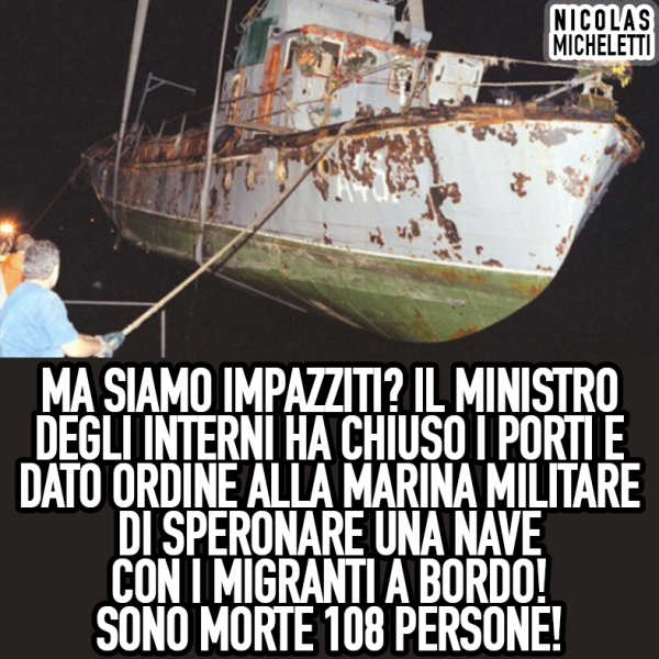 Ma siamo impazziti? Il ministro degli interni ha chiuso i porti e dato ordine alla marina militare di speronare una nave con i migranti a bordo! Sono morte 108 persone.