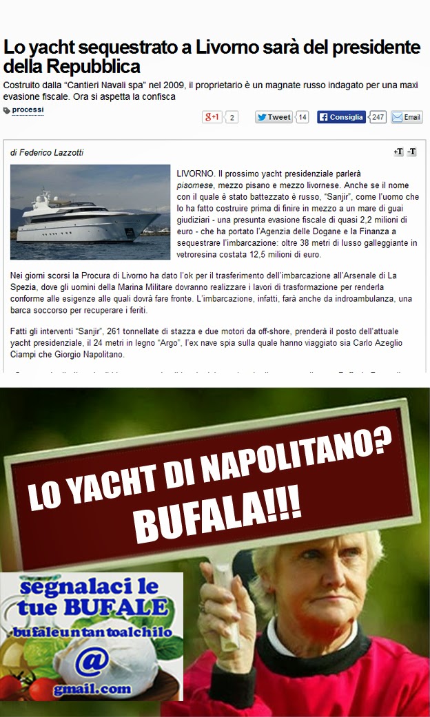 Circola la notizia che un motor yacht sequestrato ad un magnate russo che tentava di evadere l’IVA in Italia sia stato dato a dei cantieri navali per trasformarlo in yacht presidenziale Come spesso capita non ci dicono chi sia l’agenzia dietro la notizia ma chiunque essa sia è qualcuno che sta cercando in ogni modo di sdegnare l’italiano medio del proprio governo (come se ce ne fosse poi così tanto bisogno, son tutti idioti e rimbambiti, sia le facce vecchie sia quelle nuove in quel carrozzone che è la politica italiana)…