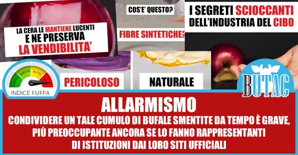 Vediamo di capirci, nel video si parla di mele cerate, i video virali sulle mele cerate risalgono al 2015 e tornarono in circolazione nel 2017. Trattati da noi su BUTAC in entrambe le occasioni, spiegando con dovizia di particolari le cose, come si può fare allarmismo condividendo ancora quei video? Il suggerimento sull’usare acqua tiepida per lavare la cera va benissimo, sia chiaro, il concetto però è che non va usata acqua per lavare la cera, bensì per lavare la frutta che stiamo per mangiare, cera o non cera che sarebbe comunque perfettamente commestibile.