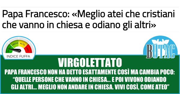 Fa strano dover riportare anche su BUTAC qualcosa di ripreso dai principali quotidiani italiani. Ma siete tanti a segnalare increduli quanto riportato all’udienza di apertura anno da Papa Francesco. Tante testate hanno titolato usando virgolettati che non erano esattamente le parole di Papa Francesco, come Leggo ad esempio: