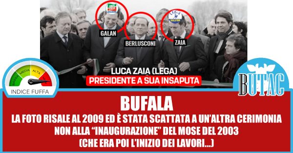 A Marco Carta quella foto non convinceva, e difatti aveva ragione: non si tratta affatto di una foto che mostra Zaia, Galan e Berlusconi all’inaugurazione del MOSE, a parte che il MOSE non è stato inaugurato e nel 2003 si dava solo il via ai lavori. Mi sono messo alla ricerca della foto per capire da dove venisse, ci è voluto per fortuna poco, la foto mostra il taglio del nastro per la consegna del Passante di Mestre, non ha nulla a che vedere col MOSE. Nel 2003 Zaia era il presidente della provincia di Treviso, e lo è stato fino al 2005.