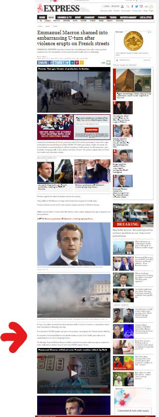 Questo è uno screenshot della pagina del Daily Express, l’articolo come vedete ha titolo, poche righe d’introduzione, un video, una pubblicità, un paragrafo, due link ad altri articoli con immagini, altro paragrafo, due immagini una con Macron e una con i gas lacrimogeni e un altro paragrafo, dove vedete la freccetta rossa è il punto in cui ci raccontano il passo indietro del titolo. Questo non è giornalismo ma pura spazzatura faziosa. Se non lo capite BUTAC non è posto per voi.