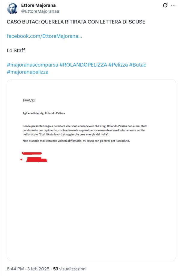 Nel febbraio 2025 la pagina X “Ettore Majorana” ha rilanciato la vicenda citando la vecchia querela, chiarendo (probabilmente senza rendersene conto) che l’unico problema di allora era una citazione errata.