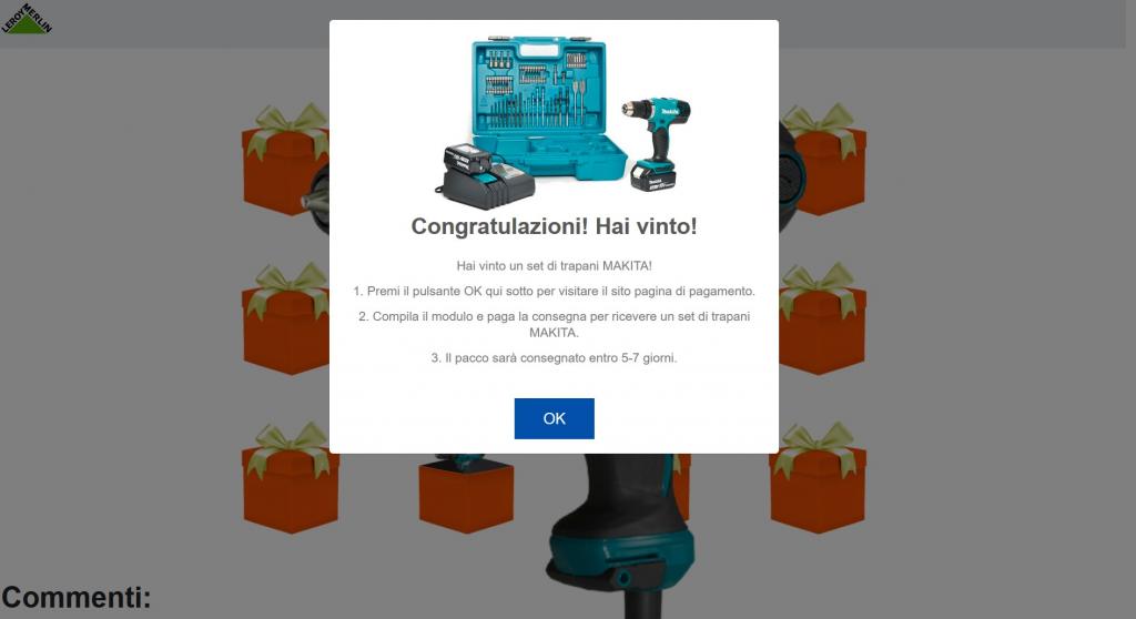 Dove una dopo l’altra vi vengono fatte domande che servono principalmente a farvi cliccare ripetutamente sulla stessa pagina, convincendovi che state davvero per arrivare a ricevere un trapano da quasi 300 euro a soli 2 euro.