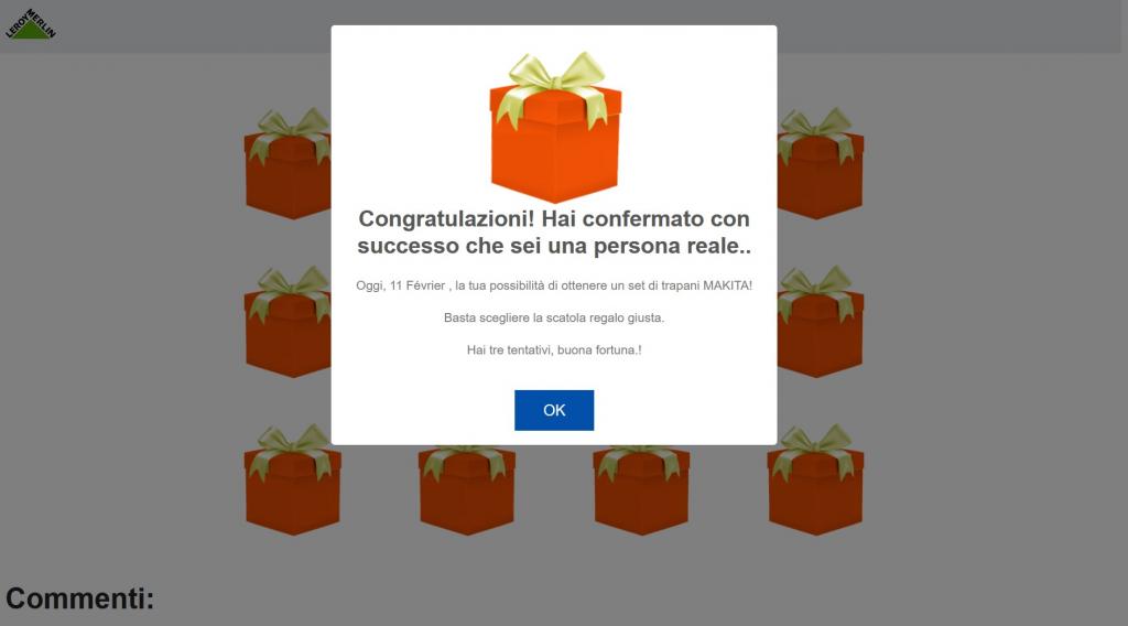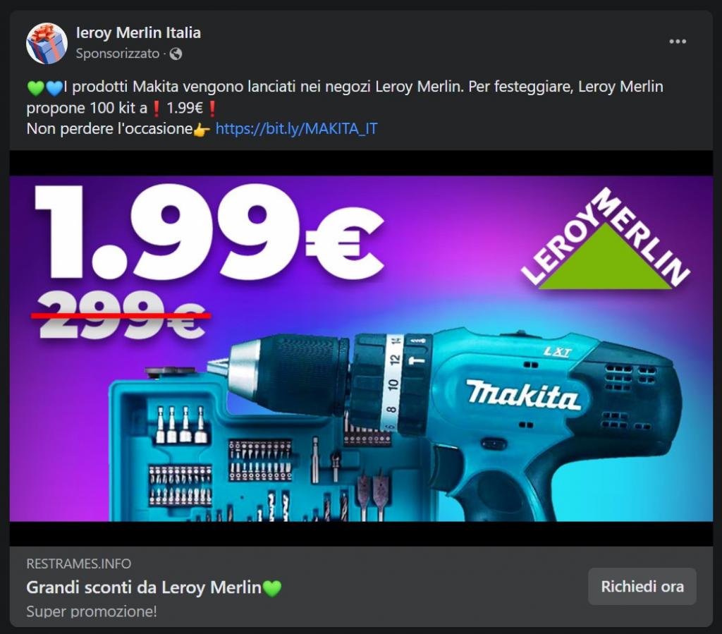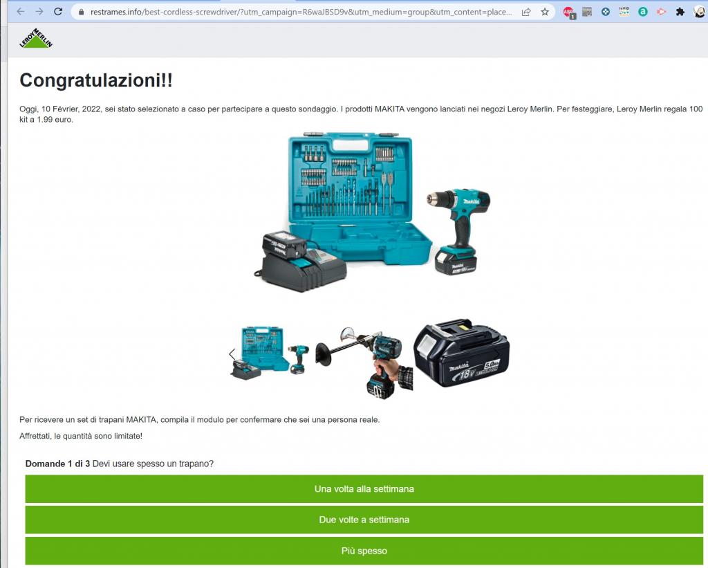 Il link a cui rimanda l’inserzione è un sito il cui dominio è stato creato in forma anonima il 7 febbraio 2022, e ovviamente non ha nulla a che fare con Leroy Merlin (che spero faccia causa a Facebook per i post sponsorizzati accettati in fase di revisione). Il post recita: