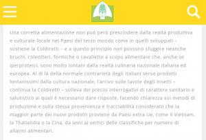 Coldiretti, per esempio, sostiene che “l’arrivo sulle tavole degli insetti solleva dei precisi interrogativi di carattere sanitario e salutistico ai quali è necessario dare risposte” perché “la maggior parte dei nuovi prodotti proviene da Paesi extra UE, come il Vietnam, la Thailandia o la Cina, da anni ai vertici delle classifiche per numero di allarmi alimentari”. Mentre il ministro Matteo Salvini precisa che “se qualcuno in Europa ha piacere a mangiare insetti faccia pure, per i miei figli preferisco i sapori e i profumi della nostra terra e li difendo” e che si opporrà “con ogni mezzo e in ogni sede, a questa follia che arricchirebbe qualche multinazionale e impoverirebbe la nostra agricoltura e la nostra cultura”.