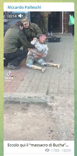 In pratica, vedendosi un manichino nel video, Palleschi evince che le immagini rappresentino la messa in scena il “massacro di Bucha” – con tanto di virgolette, a indicare che lui non condivide quella definizione, che sta solo citando quanto sostenuto da altri – e tanto gli basta per concludere che quanto raccontato degli eventi accaduti a Bucha sia falso. Nel video, che ho scaricato e potete vedere tra pochissimo, si legge chiaramente il canale di TikTok da cui è stato preso: IceFil.