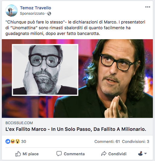 Nei mesi scorsi abbiamo visto Facebook impestata da annunci legati a soggetti come Luigi di Maio, i conduttori di UnoMattina e altri più o meno noti. Da qualche giorno invece circola legata al volto di Marco Baldini, conduttore radiofonico di successo noto anche per le sue disavventure economiche.
